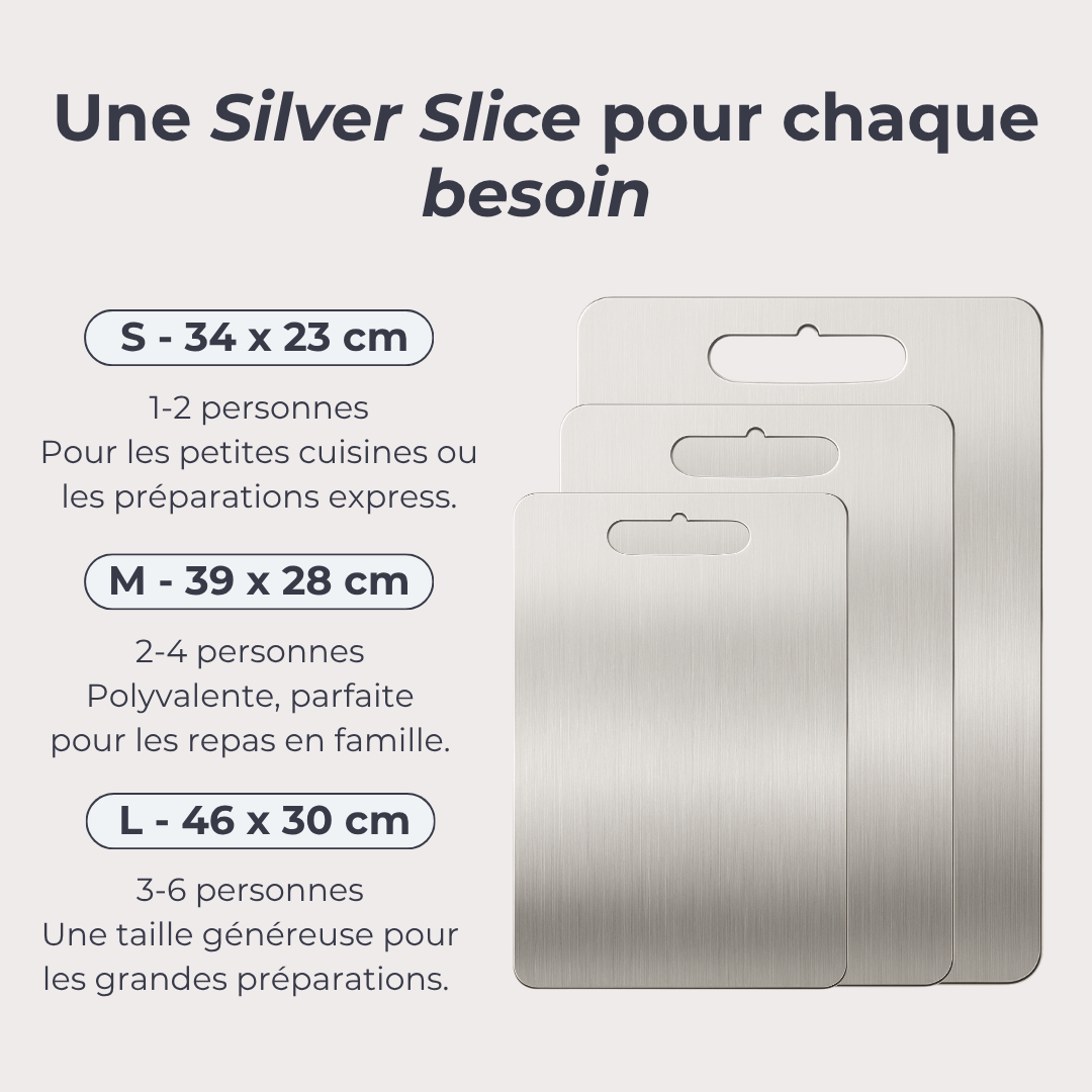 Parce que la Silver Slice n’est pas une planche comme les autres. Elle est conçue en acier inoxydable de qualité alimentaire, un matériau durable, recyclable, et sans microplastiques. Contrairement aux planches en bois ou en plastique qui s’usent, se tachent ou se fissurent, la Silver Slice vous accompagne pendant des années sans entretien. C’est un investissement dans une cuisine plus saine, plus hygiénique et plus durable.